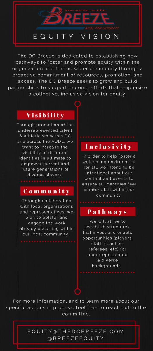 The DC Breeze is dedicated to establishing new pathways to foster and promote equity within the organization and for the wider community through a proactive commitment of resources, promotion, and access. The DC Breeze seeks to grow and build partnerships to support ongoing efforts that emphasize a collective, inclusive vision for equity.