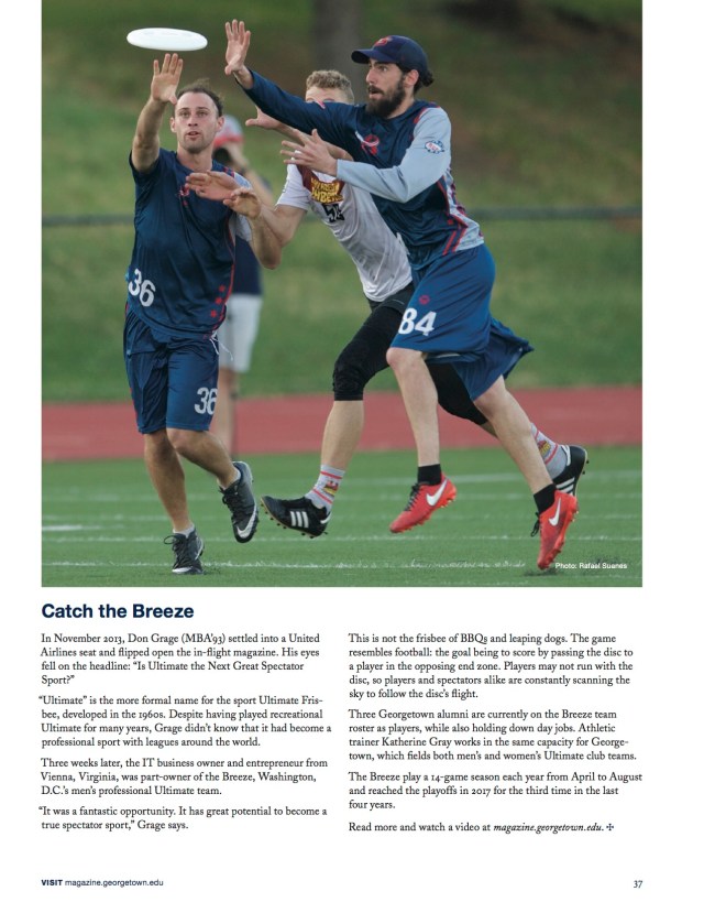 The Georgetown University Magazine’s Fall 2017 edition features an article on the DC Breeze and its many connections with the university and alumni.
