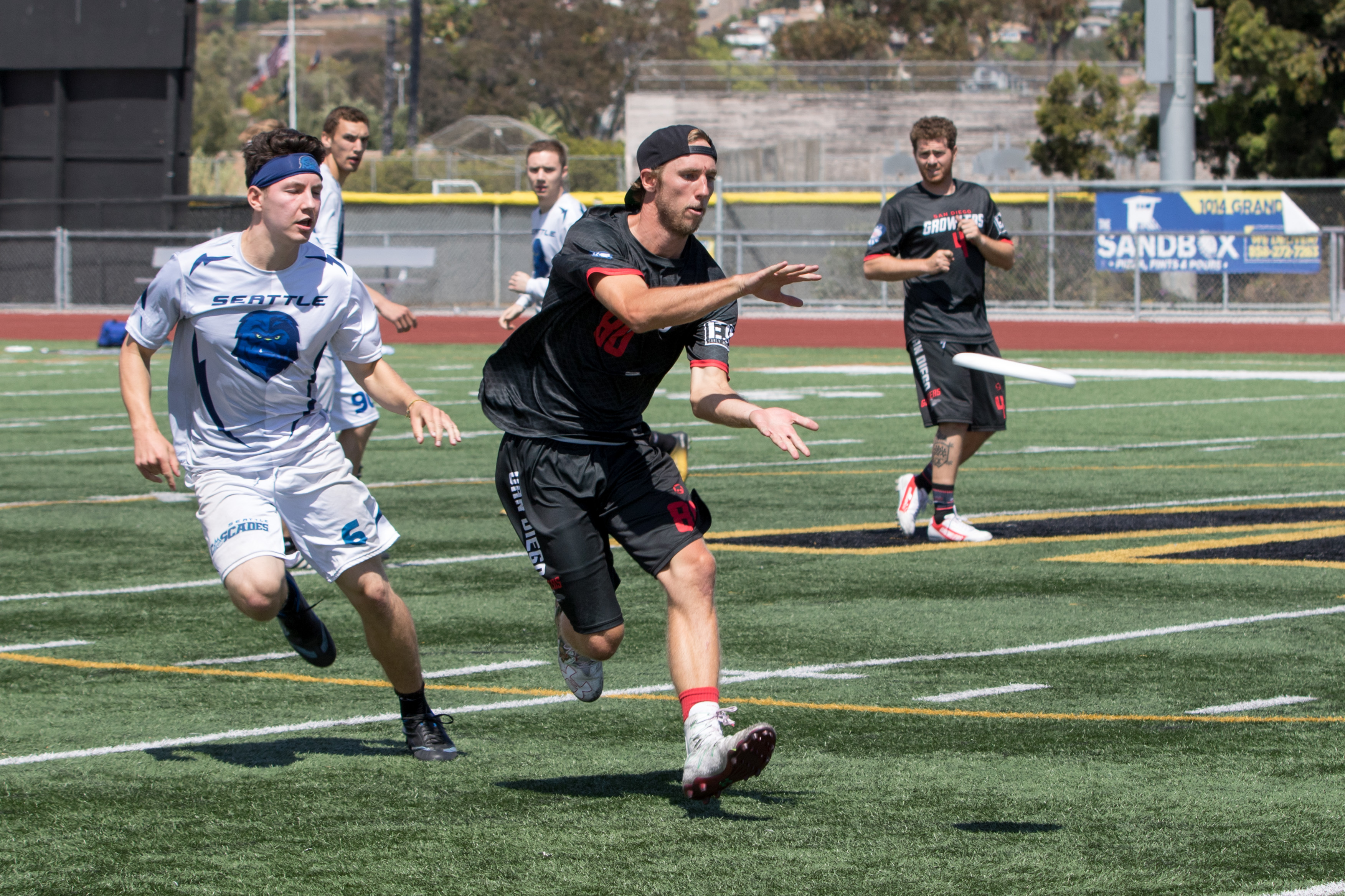 The San Diego Growlers hosted the Seattle Cascades under the Friday night lights with their sights on remaining undefeated on the season. San Diego started the game on defense with some good pressure including huge layout blocks from Sam Fontaine and Steven Milardovich, but could not take advantage of several chances. The teams traded offensive points until the Cascades secured the first break point of the game with a nice diving catch to go ahead 4-2. The teams traded a few more times, until Tim Okita found Dom Leggio seconds before the first quarter expired, with the Growlers down 6-5.