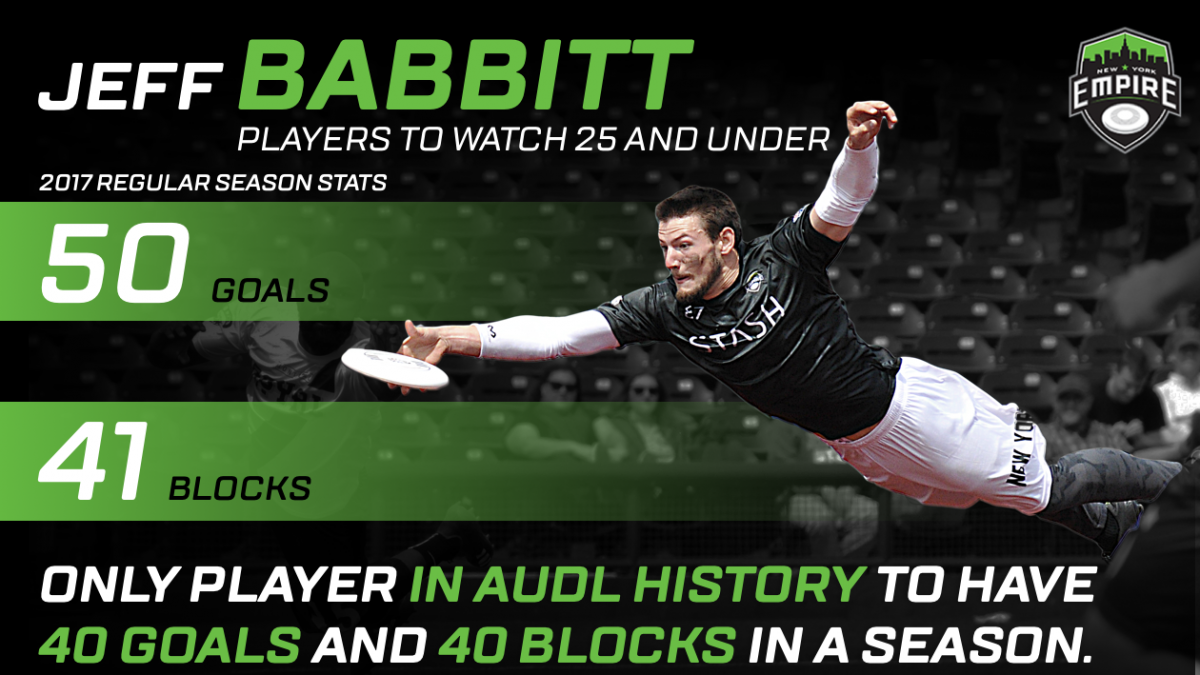 The following week in the East Division championship game, Babbitt came up big again, flying for a clutch goalline rejection in the second half and catching the game-winning goal from Ben Jagt to secure New York's first-ever victory over the rival Toronto Rush, and the Empire's first Championship Weekend appearance since 2014. And two weeks later in the AUDL semifinals against the Dallas Roughnecks, Babbitt was on his way to another big performance with one assist and three goals in the first half before sitting out the second half due to injury in a two-goal loss.