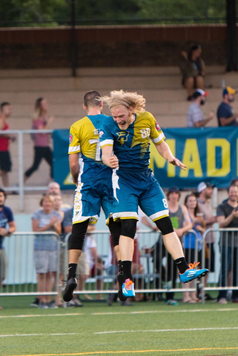 On the field, Pettit-Scantling has gone from promising-but-still-learning athlete to fully formed star. One of the most definitive plays of his career came from his belly in fourth quarter of the semifinals against the Los Angeles Aviators last year. Pettit-Scantling was battling an injury, but showed no signs of quit, helping single-handedly pad Madison’s lead. He had just scored bookends the previous possession by shutting down a Los Angeles handler and scoring on the ensuing throw. And then, as an Aviators huck went up, Pettit-Scantling found himself jockeying downfield for position with Chris Mazur. Mazur initially had a slight edge on the disc, but it wasn’t enough to shield Pettit-Scantling’s tenaciousness.