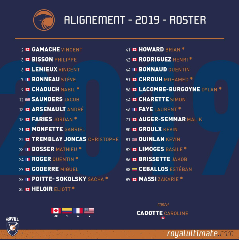 Looking to get back to the playoffs for the first time in two seasons, the Montreal Royal have released their 2019 roster. The team has gotten decidedly younger, with a handful of team veterans retiring during the offseason. Caroline Cadotte is returning as the team's head coach for the second year, and the team will be captained by Stève Bonneau, Gabriel Monfette, Kevin Quinlan, and Jake Saunders.