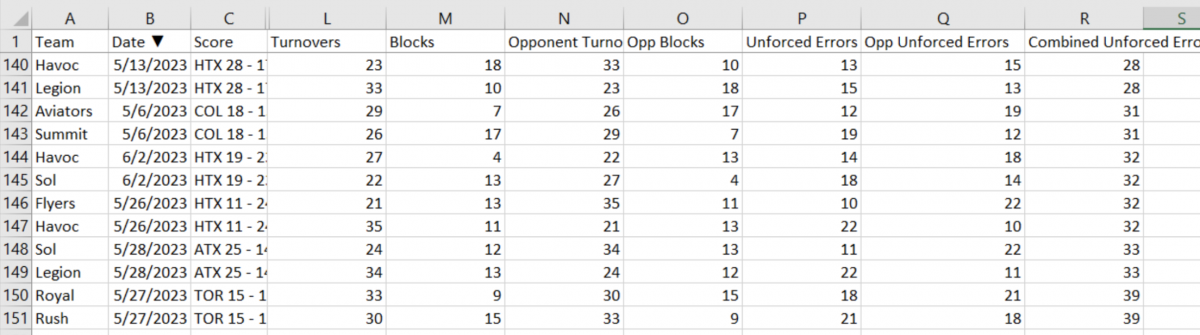 "I started looking at 'unforced turnovers' (turnovers where the other team wasn't awarded a block) across this season so far. There are only four games with less than 10 combined unforced turns. Indy played in three of them and Atlanta played in two. Worst in the league so far was a Canadian game at 39, and an Austin vs. Dallas game at 33.” Mike Kobyra, Atlanta Hustle