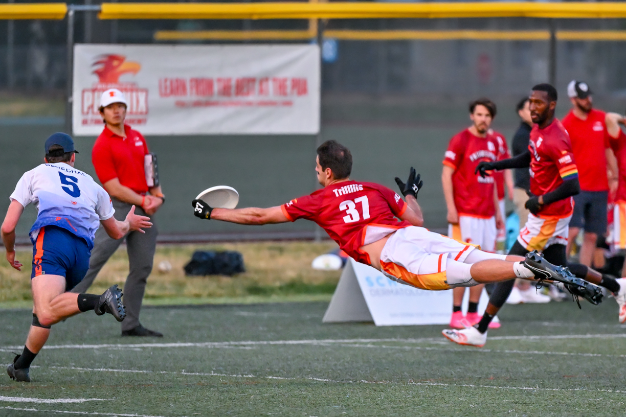 On the other side of the disc, the Hotbirds continued their impressive end of quarter tomfoolery, with not one but two buzzer beaters: one in the first and one in the fourth. The first was on a slightly short huck from Alex Thorne that Greg Martin macked into the endzone for an impressive grab by CJ Colicchio. The second was another Thorne huck that sailed over the pile into the hands of James Pollard. Speaking of James Pollard, the Phoenix big man has scored, assisted, or blocked a disc as time expired seven times this season, nearly twice as much as any other player in the league. Big Game James indeed.