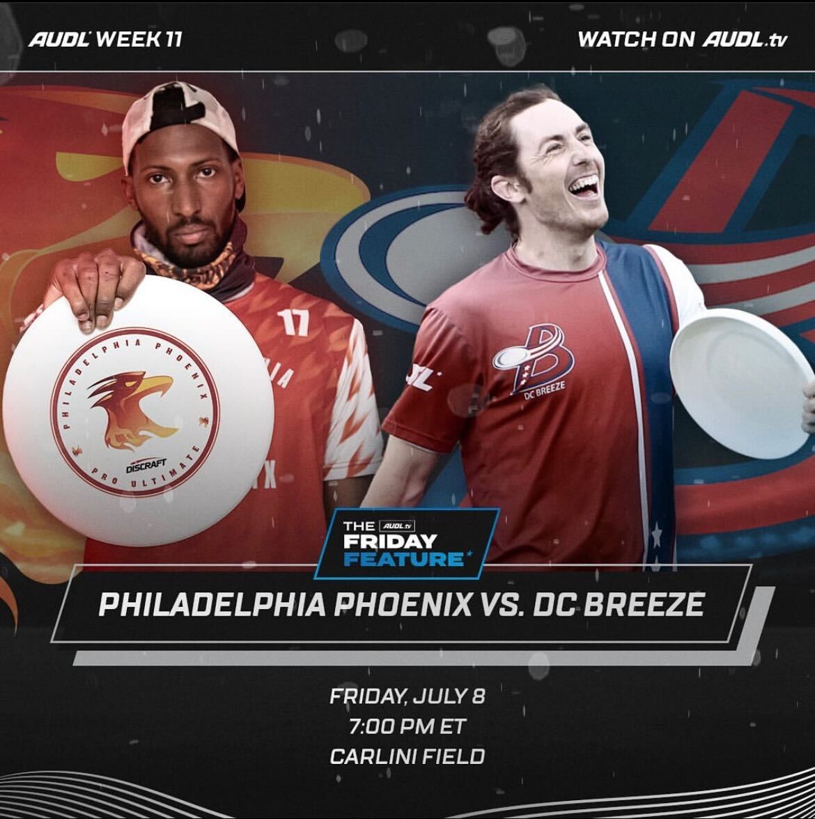 The Philadelphia Phoenix are back in action on Friday, July 8 against the D.C. Breeze at 7:00 p.m ET. As the team heads to the nation’s capital for the biggest game of the year, you can catch the game from home on AUDL.tv as this week’s Feature. You can purchase an AUDL.tv subscription for just $9.99 and enjoy replays of past games as well as all the Week 11 action from around the league.