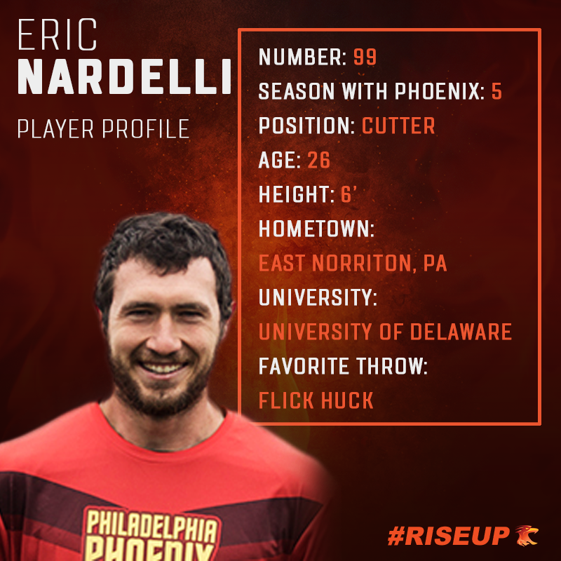 East Norriton native Eric Nardelli’s first foray into competitive ultimate was as a senior year in high school, playing with his high school’s newly formed team at Pennsylvania's state tournament in 2011. He later began playing consistently as a sophomore at the University of Delaware, where he is now Head Coach for the men’s team. Nardelli soon joined the ranks of club play, quickly earning roles as a starter and captain. Currently he is coming off a banner year having won the 2018 National Championship Tournament with his co-ed team, Philadelphia AMP. He made the transition into professional play with the Phoenix in 2015. This will be his fifth straight season with the team, marking the most consecutive seasons a player has had with the Phoenix in team history. During the 2018 season Nardelli was one of the team’s most productive defenders. As an explosive cutter and physical defensive presence, he makes an excellent captain for the Phoenix D-line and a force that East division opponents will have to reckon with. Nardelli works as a civil engineer focusing on traffic design.