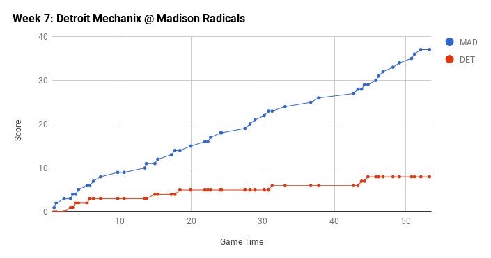 The win came in a total team effort as six different players threw 3+ assists, 11 different players scored two or more goals, and nine different Radicals defenders registered multiple blocks on the game. As a team, the Radicals completed 211-of-223 throws, good for 95 percent. After sprinting to a 6-3 lead early in the first quarter, Madison then played arguably its most dominant stretch of ultimate to date, outscoring Detroit 22-3 on a run that roughly lasted the next three quarters.
