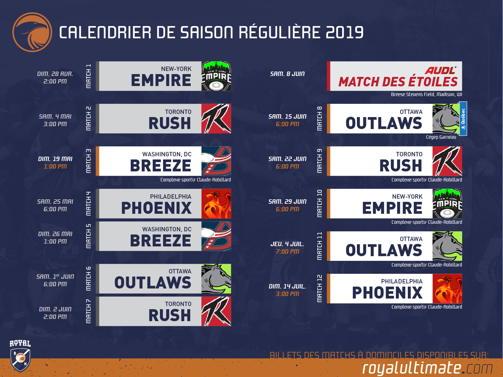 Le premier match du Royal sera à l'étranger contre l'Empire de New York. Les rumeurs disent que plusieurs matchs de la division seront accessibles en direct cette année. Vous ne voudrez pas manquer ce match contre la nouvelle ''Power house'' de la division est. L'autre match à surveiller sera une fois de plus contre les Outlaws alors que ceux-ci prendront la route pour un match à Québec! En effet, tel qu'annoncé, le Royal récidive avec un match dans la Capitale Nationale! Suite au succès de l'évènement de 2018, vous ne voudrez pas rater ce rassemblement de la communauté d'ultimate!