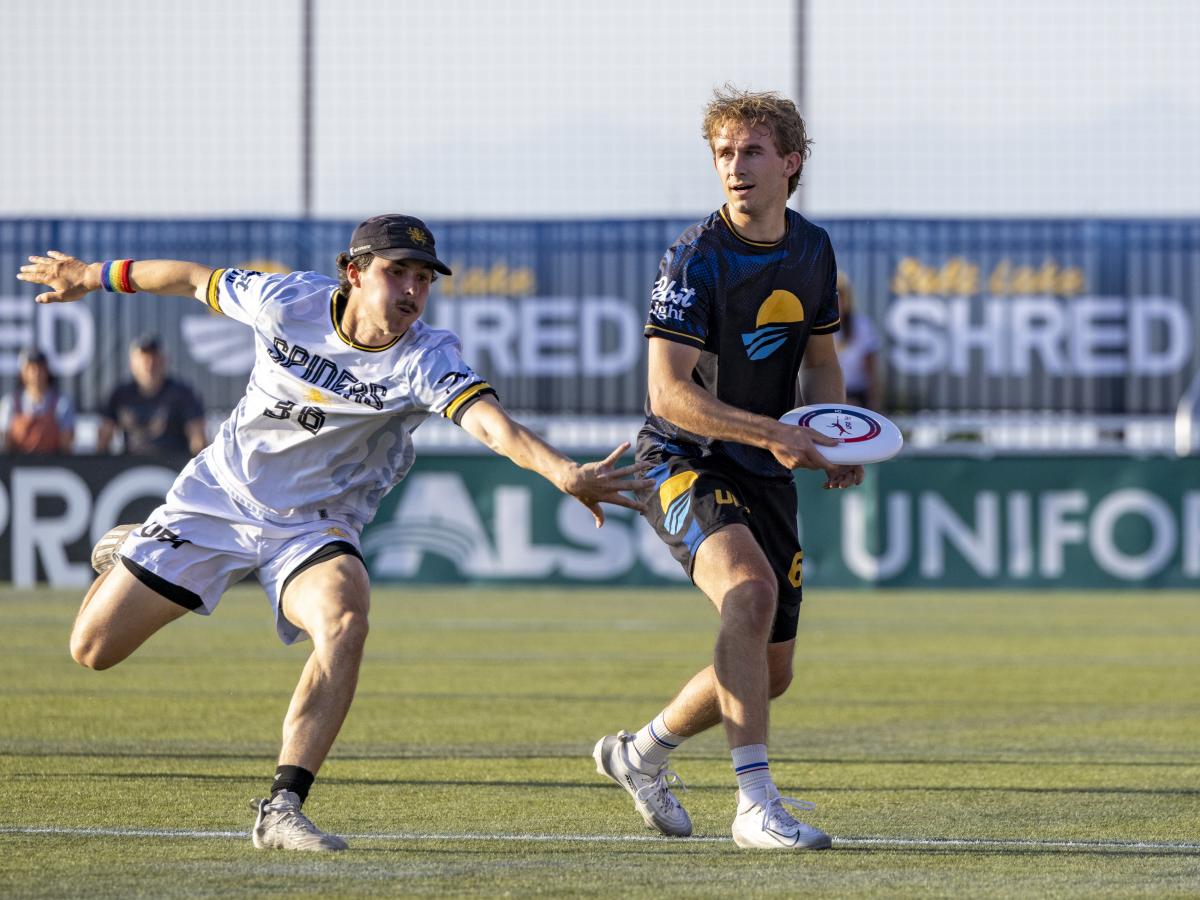 That race was highlighted by a point that lasted three minutes and flipped possession five times in the fourth quarter. It began with a Spider drop on a backwards pass that got the Shred on the doorstep of a score, but an errant throw from Kyle Weinberg gave the disc back to Oakland. Weinberg made up for this with a block that gave Salt Lake the disc again, only for the disc to be thrown away again. Then a block from Ben Ashton led to a huck that had Sam Pew huffing and puffing to make the catch just shy of the goal line and pass to Nathan Huff for the score. Pew collapsed on the sideline after expending all his energy to put pressure on Oakland and secure the goal for the Shred–and the whole team brought that same level of effort to secure the 21-25 win.