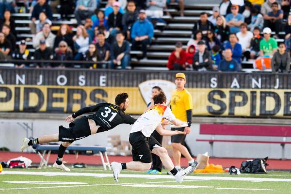 With 29 seconds to go in the quarter, San Jose trimmed the deficit to 18-17 on a 45-yard toss from Jackson Stearns to Zach Sabin. San Francisco didn’t waste any time, though, and came right back to push its lead to 19-17 with 10 seconds left. It was almost much worse for the Spiders, as the Flamethrowers almost managed to score a Callahan off of the huck, but the San Jose defense held to keep the gap at two going into the final quarter.