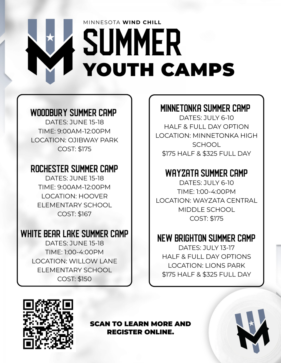 The Minnesota Wind Chill will host summer camps throughout the Twin Cities and Greater Minnesota, including in Woodbury, Rochester, White Bear Lake, St. Paul, Minnetonka, Wayzata, Robbinsdale, St. Cloud, Lakeville, Prior Lake, and Edina. Camps range from half-day to full-day formats and emphasize skill development, team play, and fun in a supportive learning environment led by Minnesota Wind Chill players and other experienced female-matching and male-matching coaches.