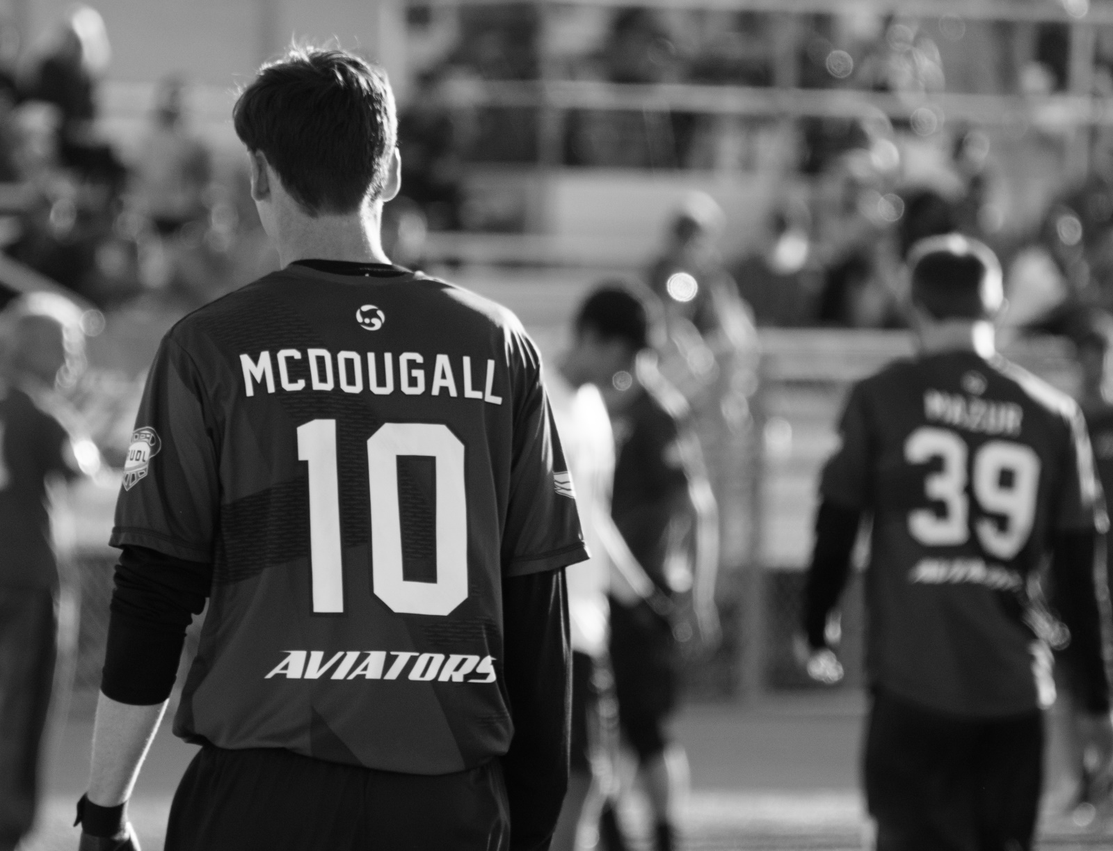 On their home field this year, the Aviators have performed similarly well out of halftime. In their home opener against the Growlers, they won the third quarter 8-3. In their next two, against the San Jose Spiders, the margins were 9-3 and 8-5. By that 2:51 mark, San Diego had outscored Los Angeles 7-4 in the quarter. Well, that just could not be allowed to stand. How’d it begin? The customary recipe for Aviators success: Disc in the air, Sean McDougall in pursuit. Jesse Cohen saw Tyler Bacon racing deep behind his defender. Cohen launched a backhand that carried sixty yards down the field. But by the time the disc had dropped back down to catching height, Bacon was swarmed by three Growler defenders. One of them, Will Turner, timed his jump better than the rest and deflected the disc away from the crowd. Enter McDougall. When the throw went up, McDougall was 15 yards behind Bacon, and half a field over. By the time the disc was tipped, he had closed to be even with the pack, though a step or two away. As the disc changed direction, so did Sean. Revving up his legs into high gear, McDougall charged around the group, adjusted his approach angle, and dove past Turner, the only defender who had any remaining forward momentum. “McDougall Makes Diving Save Off Deflection” is becoming routine these days. And in this case, it was a necessary shot in the arm, providing the initial spark for the Aviators’ comeback plans.