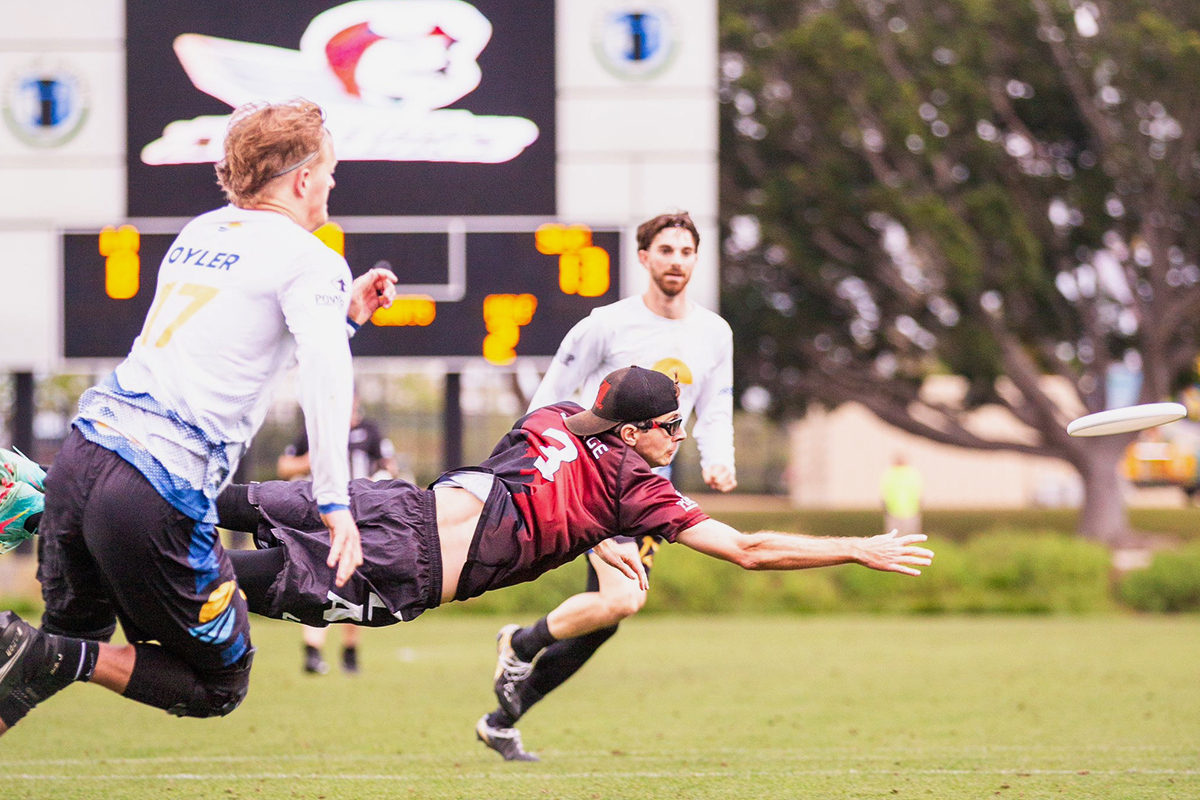 With the new venue in Irvine, the game was a homecoming for multiple players and a coach. Aviators rookies Kobi McCracken and Isamu Kawaguchi, the afore-mentioned Bryan Nguyen, and coach Andrew “Box” McRae are all alumni of the nearby University of California-Irvine. The home crowd showed their support repeatedly all game, particularly with 5:35 remaining in the 3rd quarter when McCracken scored his first career professional goal. The play was setup when Andrew Padula, who is Top-5 on L.A.’s all-time lists in games played and blocks, earned one of his team-leading four blocks on the season by showcasing his patented full-field sprint off the pull and carrying his momentum all the way through Salt Lake’s first throw of the possession. During the Aviator possession, the frisbee found its way back into Padula’s hands, who was fouled and able to center the frisbee on the goalline. McCracken was isolated in the endzone, and Padula snuck a backhand into a very tight window for McCracken to snag just in front of a defender. McCracken’s ensuing spike showed all the emotion one would expect for a first-career goal in front of a crowd of friends and family.