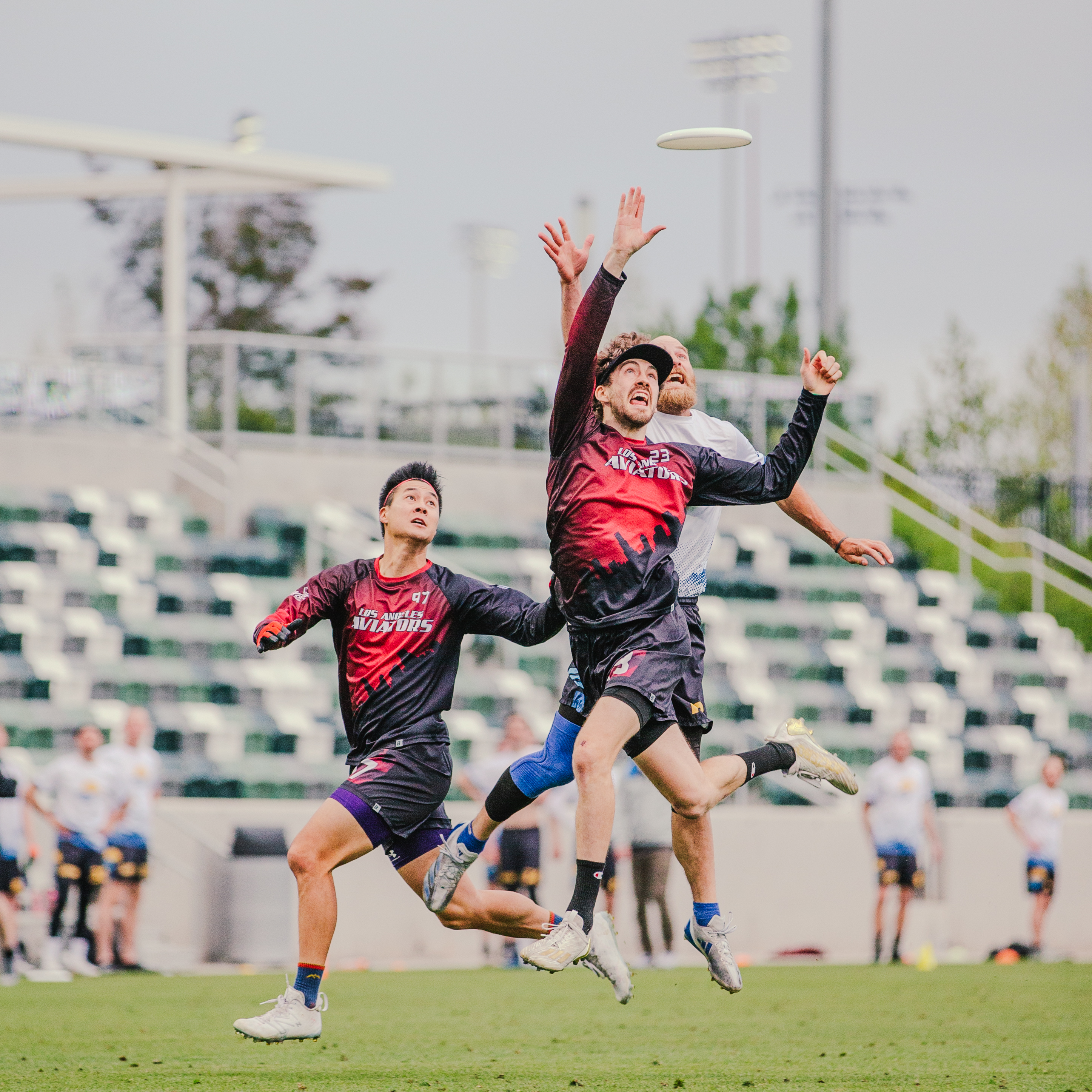 The first goal of the Aviators’ debut in Championship Stadium at Great Park in Irvine came from a couple blasts from the past. Brent George donned the Los Angeles kit for the first time since 2018, and Bryan Nguyen saw his first playing time since 2017. The play began with Everest Shapiro sending a 50-yard huck deep to Nguyen, who read the disc better than his defender and brought it down 15 yards out of the end zone. George followed up and received the short dish pass to initiate the give-and-go from Nguyen, who immediately cut upfield into the endzone. George threw a pivot and a fake to move the impeding defender, and used a nifty inside-out forehand to hit Nguyen in the endzone. It was a poignant moment all around for L.A., both to cut the five-point streak the Shred were on, and to mark the beginning of an exciting era of players for the 2024 season.