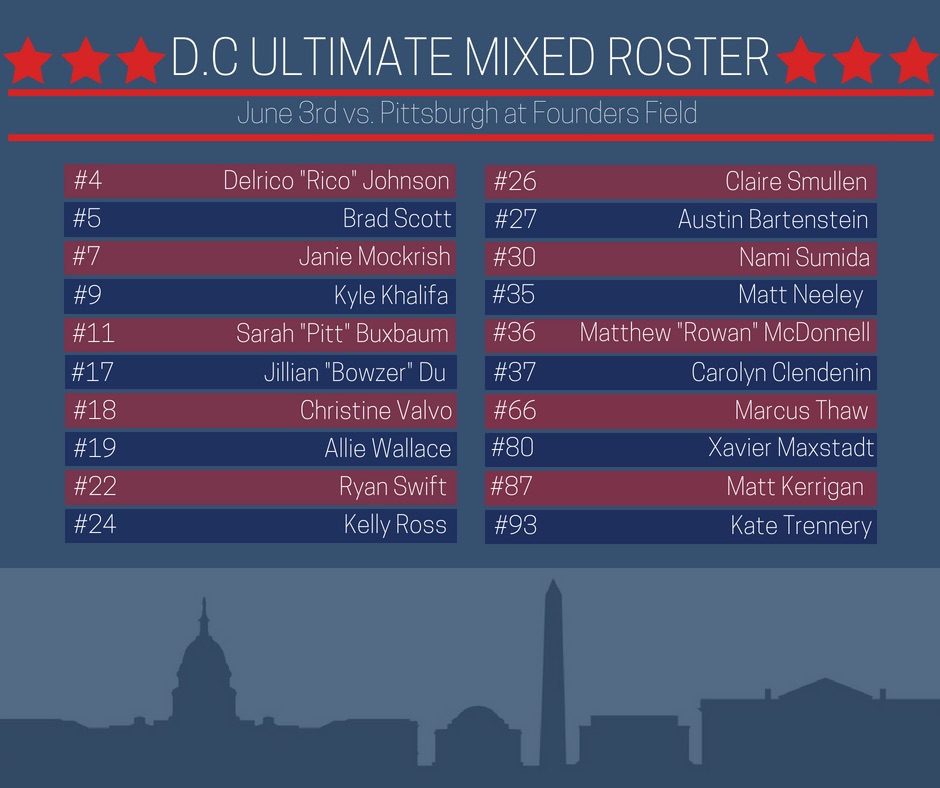 History will be made this weekend in Pittsburgh as the first ever D.C. professional mixed ultimate team takes on Pittsburgh Supercell on Sunday at Founder’s Field in Cheswick, Pennsylvania. The 20-person D.C. roster includes 10 players from the Breeze, including team goals and assists leader Matthew “Rowan” McDonnell. Ten elite women’s players from around the area round out the D.C. squad.