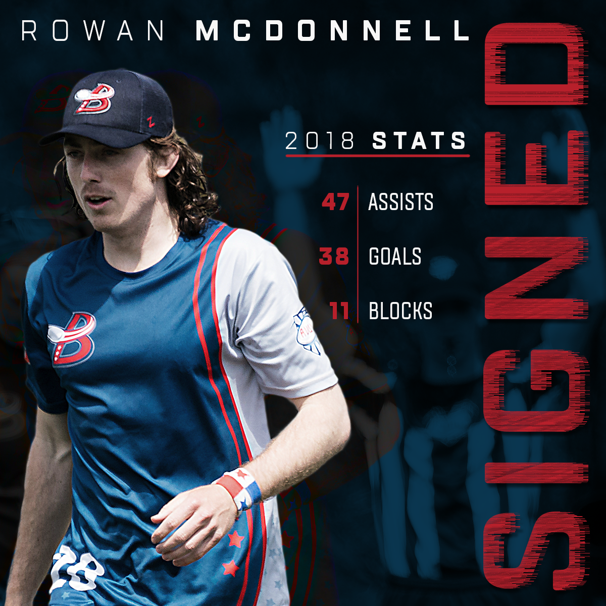McDonnell finished the 2018 regular season with 47 assists, 38 goals, and 11 blocks as he led the Breeze to their third straight playoff appearance. He completed a career-high 95.9 percent of his throws, and he scored on 29.7 percent of his total points played, the fourth-highest scoring rate in the league.
