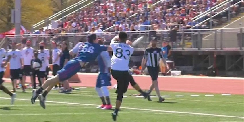 Delrico Johnson going up for an acrobatic grab against the Toronto Rush.