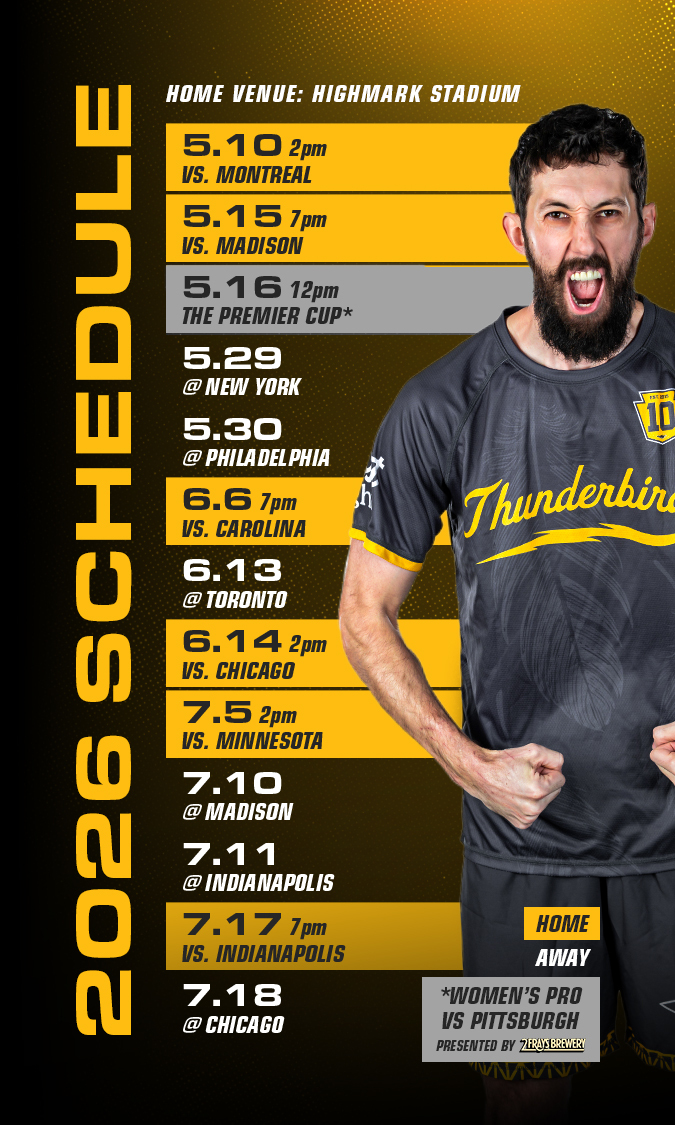 The Pittsburgh Thunderbirds is a professional Ultimate Frisbee® organization in the Ultimate Frisbee Association™ (UFA). The team is part of the Central Division and plays against the Indianapolis AlleyCats, Minnesota Wind Chill, Chicago Union, and Madison Radicals. The UFA’s 12-game season commences in April and ends with the UFA Championship in late August.