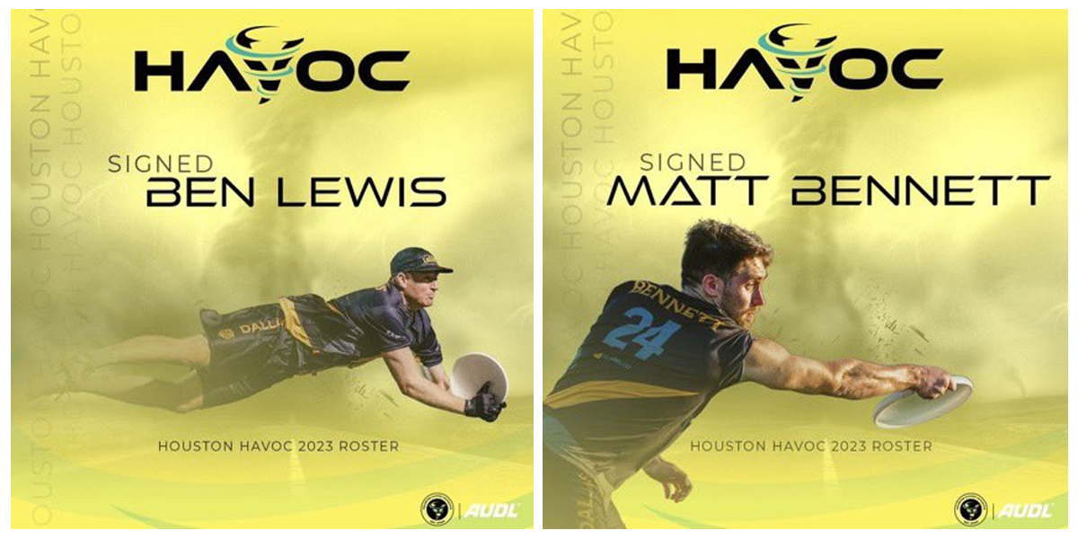 The Houston Havoc have signed handler Matt Bennett and defender Ben Lewis as the team’s first official players entering the 2023 season. Both players are Texas A&M alumni and AUDL vets, beginning their professional careers in 2016. Bennett and Lewis most recently played as teammates for the Dallas Legion in 2022.
