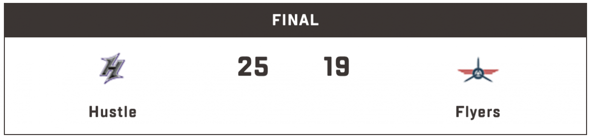 After an hour-long rain delay, the Hustle came away with an important 25-19 road win over the Carolina Flyers. The wet conditions on the field caused slips and slides, but it did not faze the Hustle’s efforts in the victory. It was a tight game in the beginning, with both sides trading scores throughout the first half. The Hustle took a one score lead (10-9) into halftime and came out strong in the second half, pushing that lead to 6 by the end of the game.