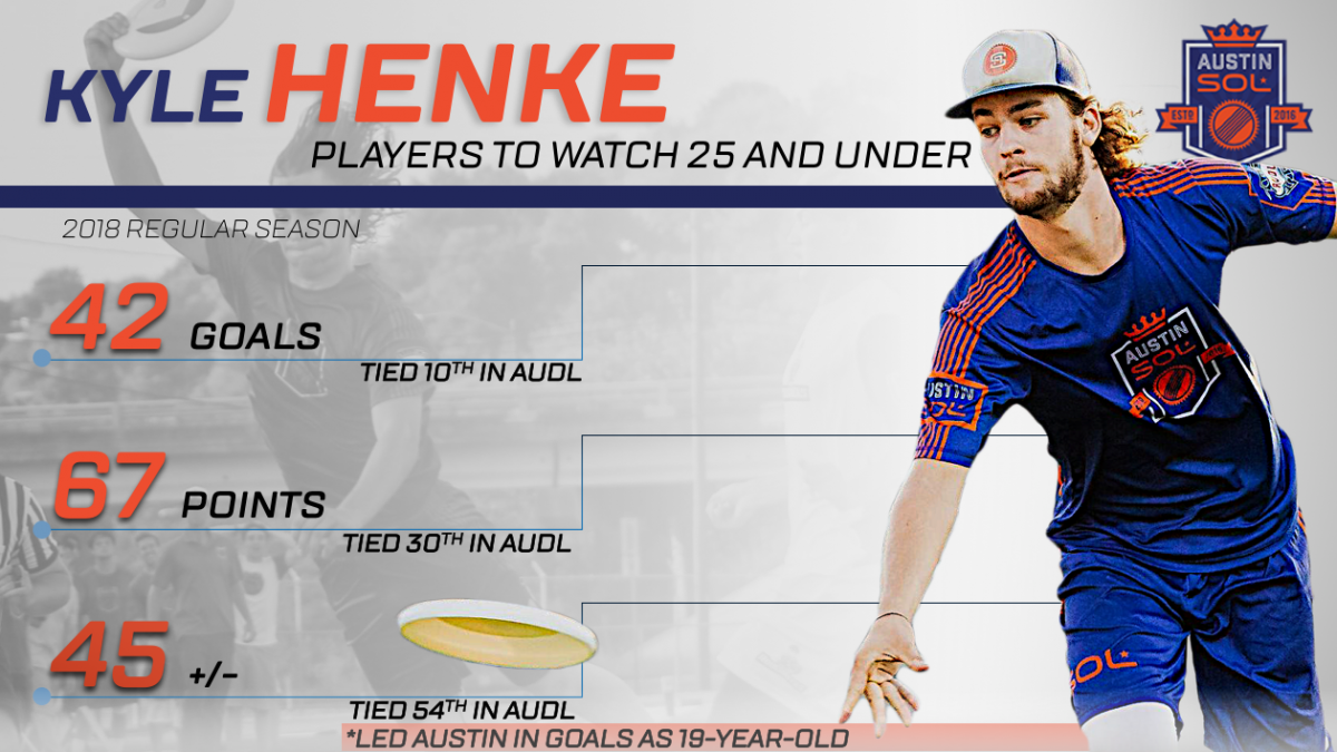 As one half of the Austin Sol's dynamic teenage duo known as the "Stench Bros", Kyle Henke had a breakout year in 2018. The 20-year-old led the Sol in his second year as a pro with 42 goals during the regular season, helping Austin earn its first playoff berth as a franchise in the process. And while his production volume as a scorer on the stat sheet is eye-catching, Henke stands out for a playmaking flair that far exceeds his not-quite-drinking-age youth.