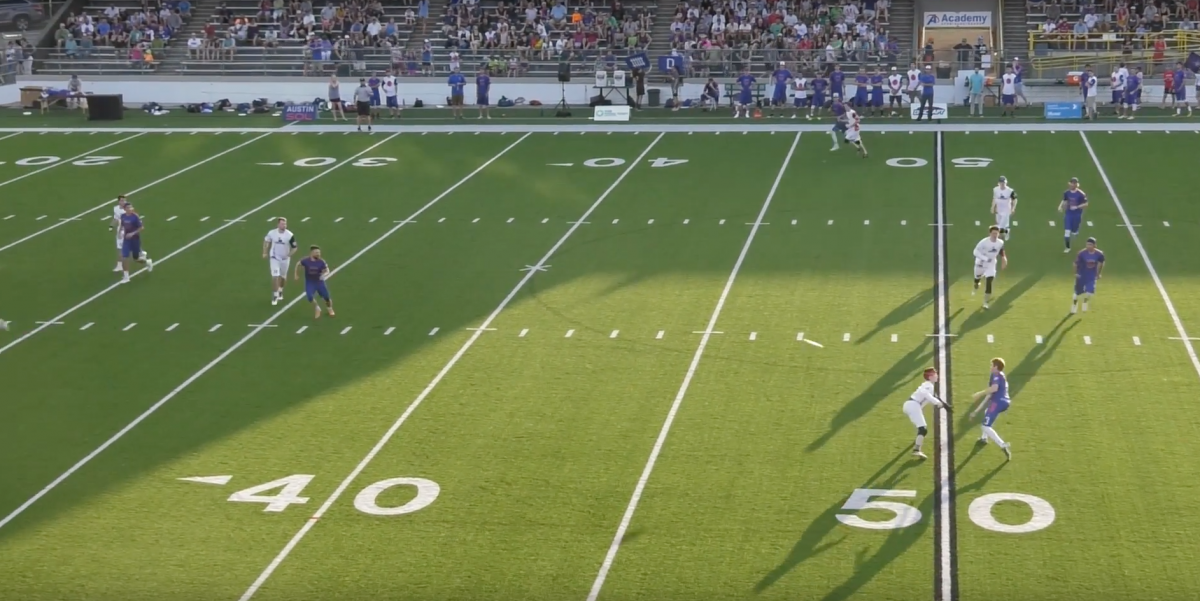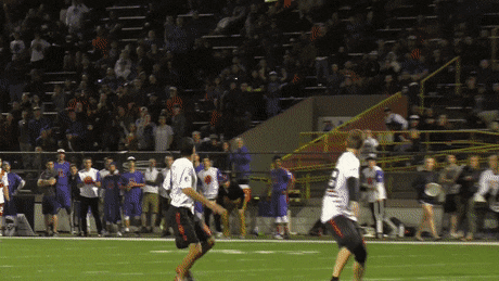 That's Henke at the top of the frame, jockeying with Dallas' Chris Larberg at the 48-yard line. A hustle defender who has been one of the most consistent defensive performers for the perennially playoff bound Roughnecks, even Larberg is not ready for Henke's blitz. Matthis' inside-out throw begins to dive away from its target, taking a steep angle for the sideline and seemingly destined to land out of bounds. But like a freight train loosed from the tracks, Henke comes barreling from out of nowhere at top speed, snagging the disc inches from the line and crashing to the ground for a goal that registered somewhere in the mid 5s on the richter scale.