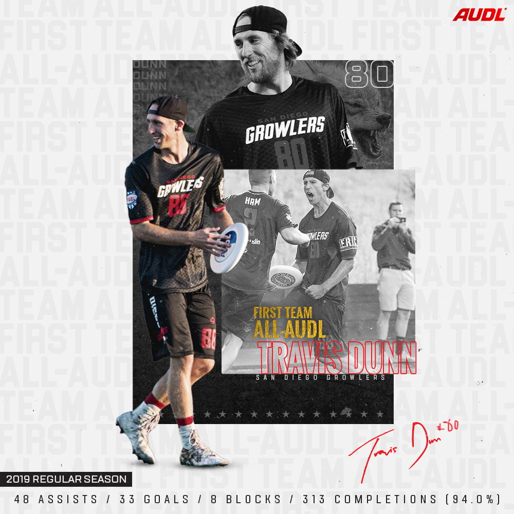 The San Diego Growlers finished 2019 with the second highest scoring offense and the second most efficient offense in the league, and the lion's share of credit goes to Travis Dunn. Making his second consecutive All-AUDL selection, Dunn is perhaps the most consistent offensive performer in the league. This year, Dunn had no games with fewer than three assists, and just two outings without scoring multiple goals.