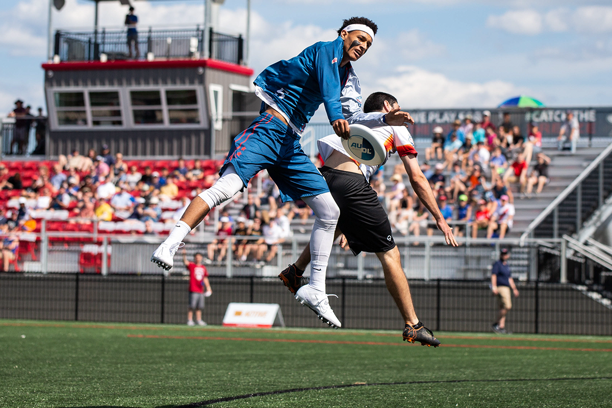 Just before halftime in an 8-7 game — to this point no team had held more than a one-goal lead — the Royal received the pull and were looking for the tie. Around midfield, Montreal’s Sacha Poitte-Sokolsky floats a high backhand behind cutter Mathieu Bosser, who’s defended by Merriman. Attacking the air space, Merriman rises up over the back of Bosser to grab the disc with two hands, landing hard on his back as he makes the catch through contact. But the fall is nothing for the 19-year-old playmaker, and he pops back up immediately to find teammate Kris Harrison for the dump, who then swings it to defensive captain David Bloodgood. After getting rid of the disc, Merriman clears out hard and, realizing that he can out-hustle his defender, continues his cut into the open deep space towards the end zone. Bloodgood tosses a beautiful leading backhand, and Merriman’s well-timed cut is rewarded with a goal.