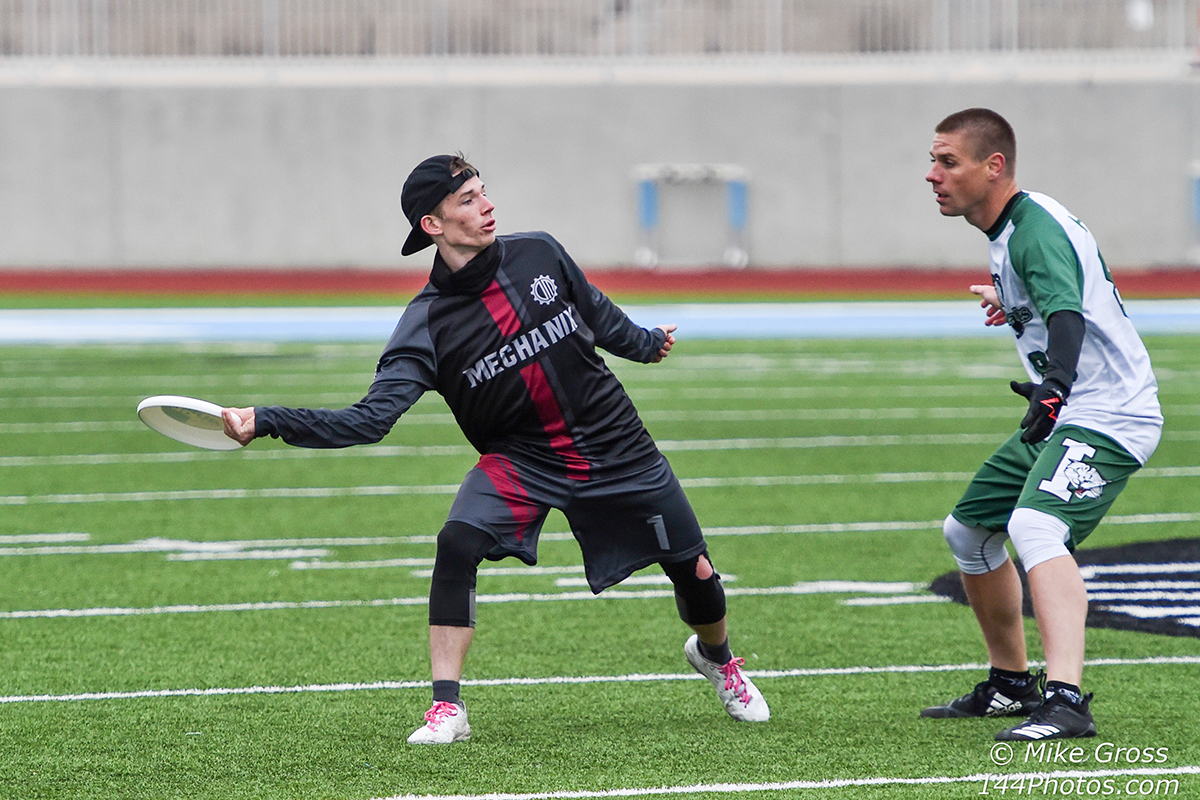 In a 10-7 game halfway through the second quarter, the Mechanix found themselves in unfamiliar territory, as they looked to keep their foot on the gas and continue to build their lead. Just past midfield, Cubitt uses his quickness to initiate a strike cut, looking to give teammate Austin Riegel an upline option. Riegel puts up a leading flick which Cubitt lays out for, grabbing the disc inches from the ground and sliding an extra few yards for a 20-yard pickup. Now less than 15 yards from the end zone, Cubitt sets a left pivot foot (for a righty throw, presumably) and surveys his options to find Riegel looking to return the favor with a strike cut of his own. Knowing he wants to float the throw more than Riegel’s previous flick, Cubitt steps forward with his right foot and opts for this awkward yet cool-looking lefty backhand. Riegel easily runs onto the disc for the score, and Cubitt has gifted the Mechanix with their biggest lead of the season.