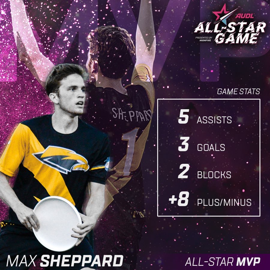 - Max Sheppard, Pittsburgh Thunderbirds (Team KPS) — After watching the entire game closely and scanning the postgame statistics, making Max Sheppard the MVP was not a hard call. The 23-year-old Thunderbird—he’ll turn 24 in 11 days—led all players with a plus-8, accumulating three goals, five assists, and two blocks throughout his impactful performance, completing 22 of his 23 throws. He also played with a steady composure and assertiveness that fit the tone and intensity of the evening, deferring to teammates at times and taking over appropriately on occasion. Perhaps fans around the league were not too familiar with Sheppard prior to Saturday night, but his performance on the big stage will elevate his stature going forward. Helping his Pittsburgh Thunderbirds team qualify for the playoffs in the competitive Midwest would be an even bigger boost for Sheppard and his burgeoning superstar career.