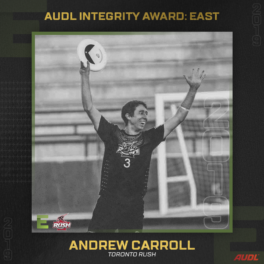 Andrew Carroll receives the East Division AUDL Integrity Award. A five-year Rush veteran, Carroll became a primary O-line cutter for the Rush in 2017, and over the past three seasons he has accumulated 85 assists and 79 goals in 31 regular season games (5.3 scores per game avg.).