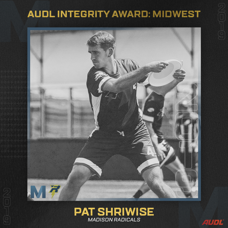 Pat Shriwise is awarded the AUDL Integrity Award for the Midwest Division. Shriwise has played on the Radicals since the beginning, splitting his time evenly between offense and defense his rookie season before becoming an offensive stalwart starting in 2014 and continuing through 2019. Shriwise ranks 18th in career games played, with 95 over seven seasons. He has averaged over 3.5 scores (goals plus assists) per game for his career.