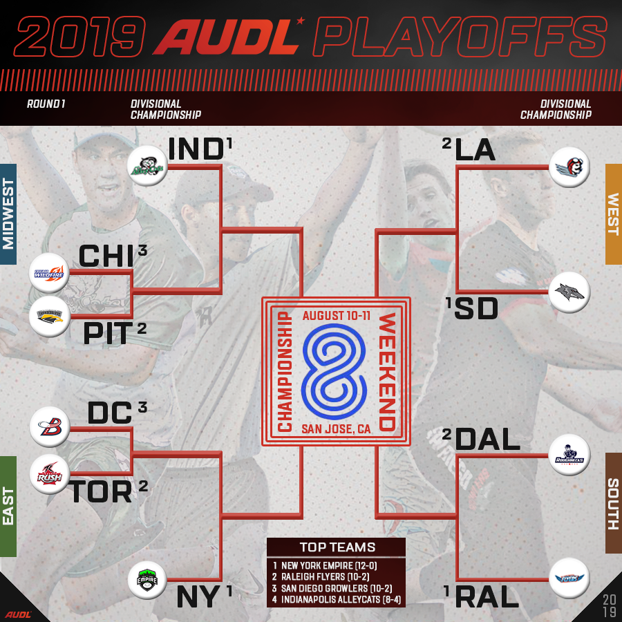 The 2019 AUDL playoffs have arrived! 10 teams from the four divisions have qualified for this year's postseason, with the New York Empire, Raleigh Flyers, San Diego Growlers, and Indianapolis AlleyCats emerging as divisional champions from the regular season. This weekend begins a two week playoff gauntlet to determine which four teams will represent their divisions at 2019 AUDL Championship Weekend in San Jose, CA on August 10-11.