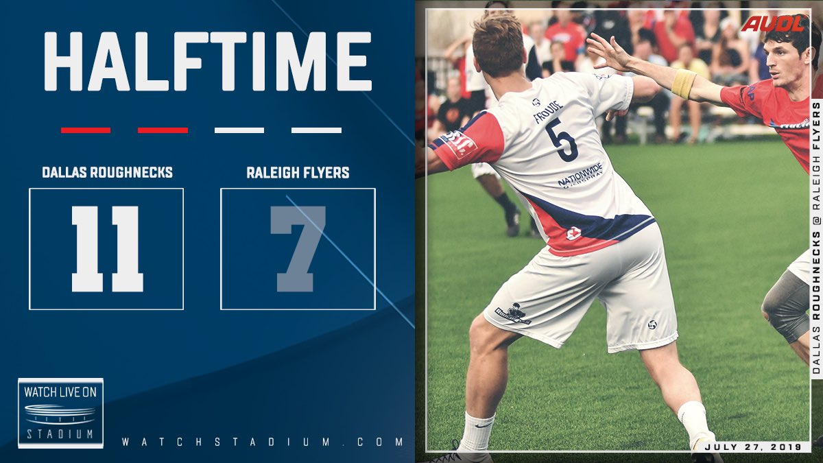 8:22PM, AR — One of the big questions entering tonight's game was "What does Dallas' best performance look like?" And against a team as talented as Raleigh, this has to be it. They're being efficient and (boringly) safe with their offensive possessions, and converting almost at will. Definsively, they're doing a great job of getting after the disc and not giving the Flyers any easy throws. The Roughnecks are continually forcing the Flyers into alternative looks and routes, and it's paying dividends with their halftime lead.