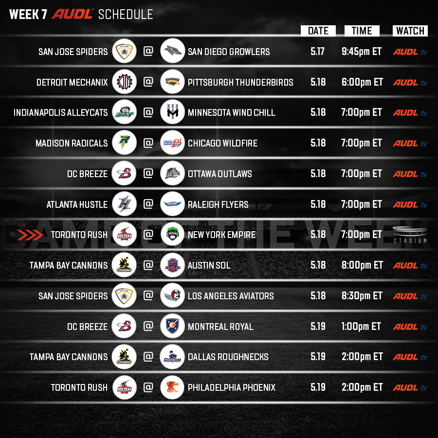 A big weekend of rivalry matchups in Week 7 as a 12-game slate kicks off on AUDL.TV midway through the 2019 AUDL regular season. The AUDL Game Of The Week on Saturday night features a tantalizing rematch of the 2018 East Division championship game thriller between the Toronto Rush and New York Empire on Stadium