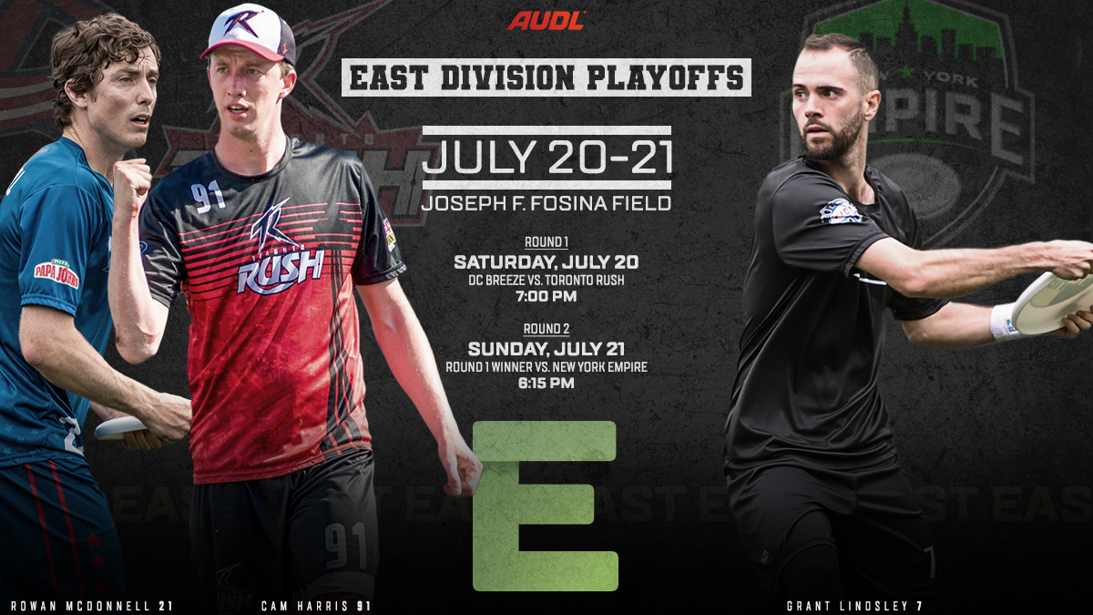 The 2019 East Division playoff field is set, with the DC Breeze, Toronto Rush, and New York Empire all qualifying for their third straight playoff appearances. The divisional playoff series will take place on one weekend in New York, with the third seeded Breeze facing off against the second seeded Rush on Saturday, July 20 at 7:00 PM/ET. The winner of the first round matchup will then face the regular season, undefeated divisional champion Empire on Sunday, July 21 at 6:15 PM/ET for the right to represent the East Division at 2019 Championship Weekend. Both divisional playoff games will be available live on AUDL.TV.