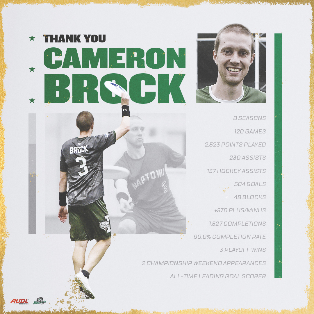 After eight seasons with the Indianapolis AlleyCats, AUDL goal scoring leader Cameron Brock announced his retirement from professional ultimate. Brock ends his career as the most prolific offensive player in league history, ranking first all-time in goals (504), 10th in assists (230), first in scores (734), first in games played (120), and first in points played (2523).