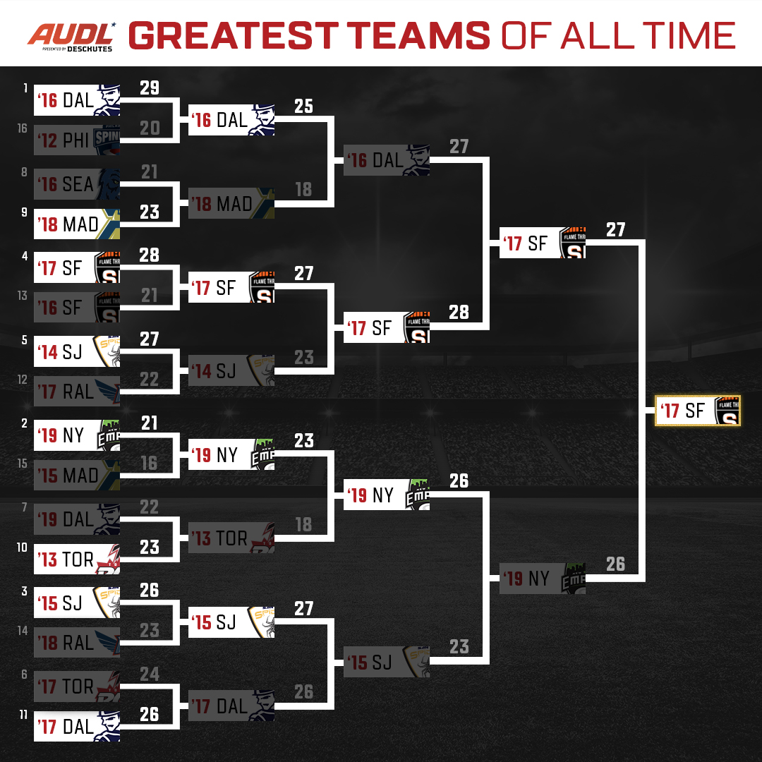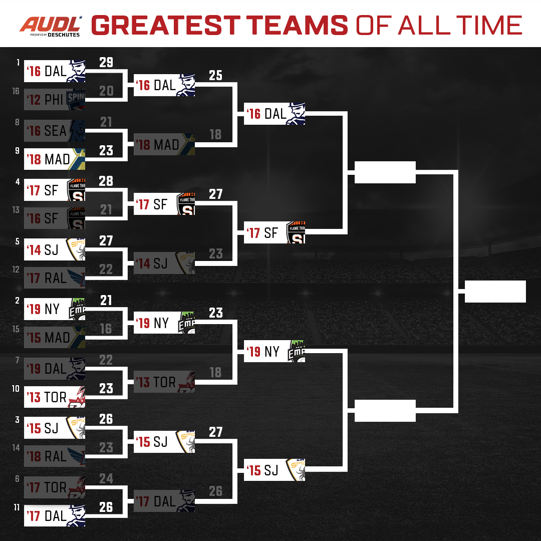 Of course, it does make sense that the sport’s greatest champion is prominently involved in the semis and finals of the Greatest AUDL Teams of All-Time Tournament. Here’s perhaps the most absurd element of this whole project: Beau will by default accrue three times as many (imaginary) playoff losses in the climactic two rounds of this alternate universe exercise than he has endured in six seasons actually competing in the AUDL, in which his postseason record is an otherworldly 17-1 with five championships.