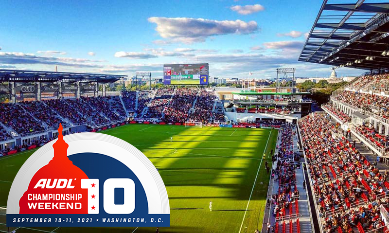 In just under a month, Audi Field in Washington, D.C. will host AUDL Championship Weekend 10. The eight playoff teams are decided—Atlanta Hustle, Chicago Union, Dallas Roughnecks, DC Breeze, Minnesota Wind Chill, New York Empire, Raleigh Flyers, and San Diego Growlers—and now tickets are available for the final four style championship event of the season, held on the weekend of September 10-11.