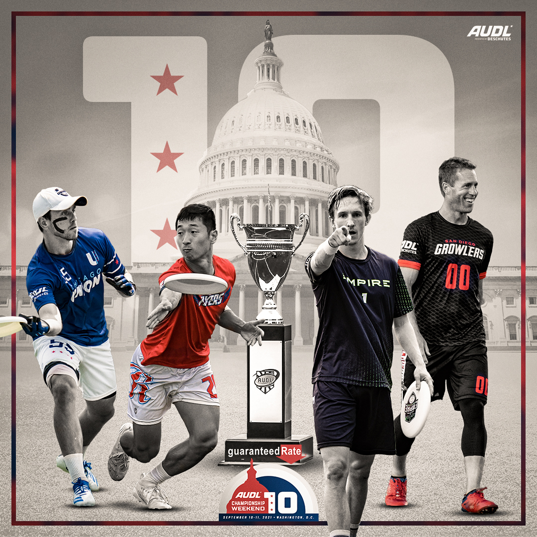 The 2021 AUDL Championship Weekend bracket is set! The final four teams—the Chicago Union, New York Empire, Raleigh Flyers, and San Diego Growlers—will compete for the league title on September 10-11 at Audi Field. Both semifinal games will be played on Friday, with the championship game the following night on Saturday. Tickets are on sale, and all three games will be available to watch live on AUDL.TV.
