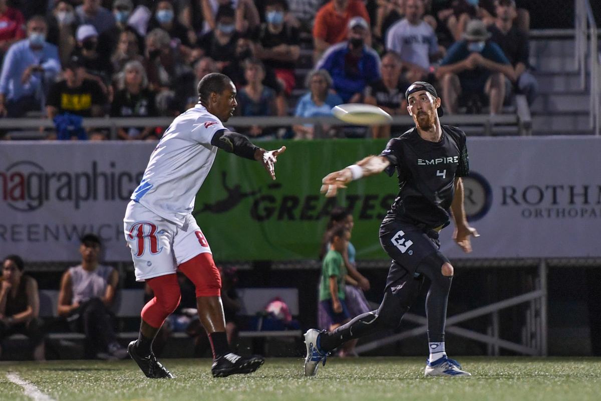 The two teams met in Week 10 of the regular season. The Flyers forced the first overtime by driving down the full length of the field and scoring with under 10 seconds late in regulation. Raleigh had the disc, a two goal lead, and just 36 seconds remaining in the first overtime before New York utilized trap double team defenses to generate two turnovers, tie the game, and enter sudden death. After each team traded a turnover, Jack Williams found Jeff Babbitt for the finisher and the Empire win; Williams has had five game-winning, walk-off assists or goals in the last two seasons for New York.