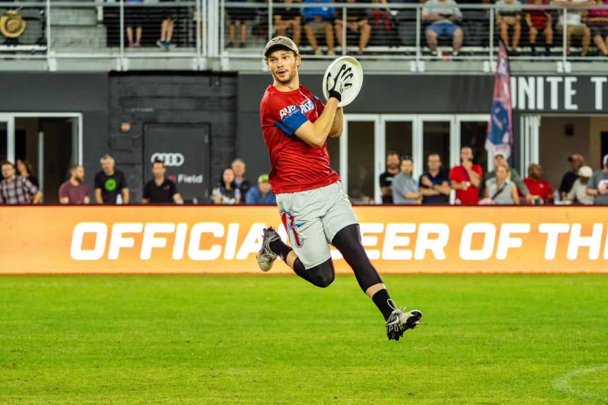 Sol Yanuck catches a swing pass in the 2021 AUDL Championship Game. Photo by Evan Bernstein
