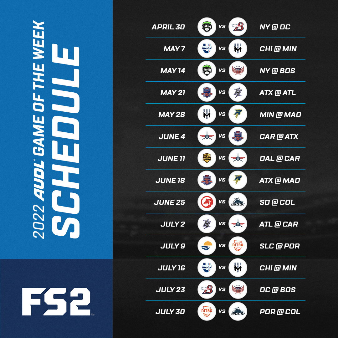 Night-of and replay broadcast availability times listed below. All "Game Of The Week" games will become available for subscribers on watch.AUDL.tv 30 days following the FS2 program.