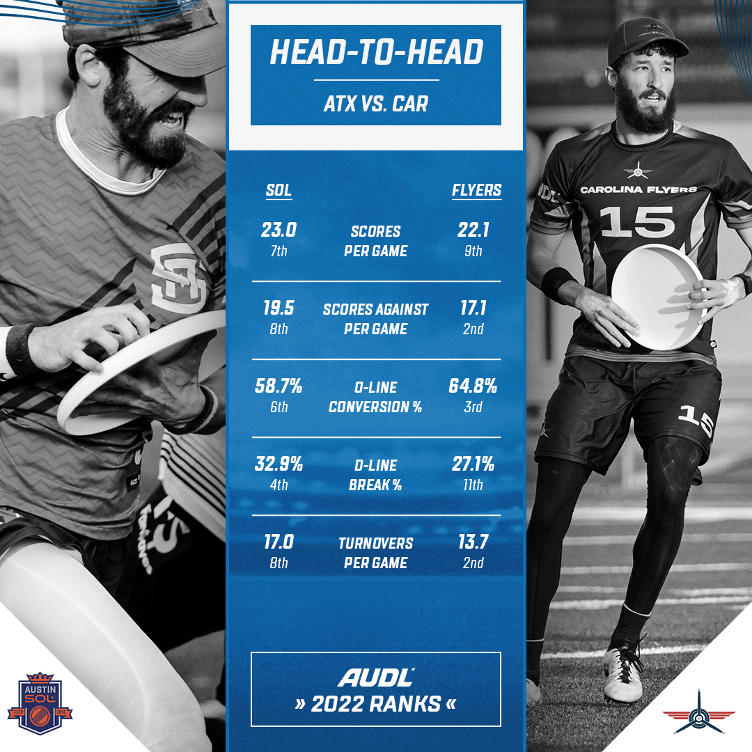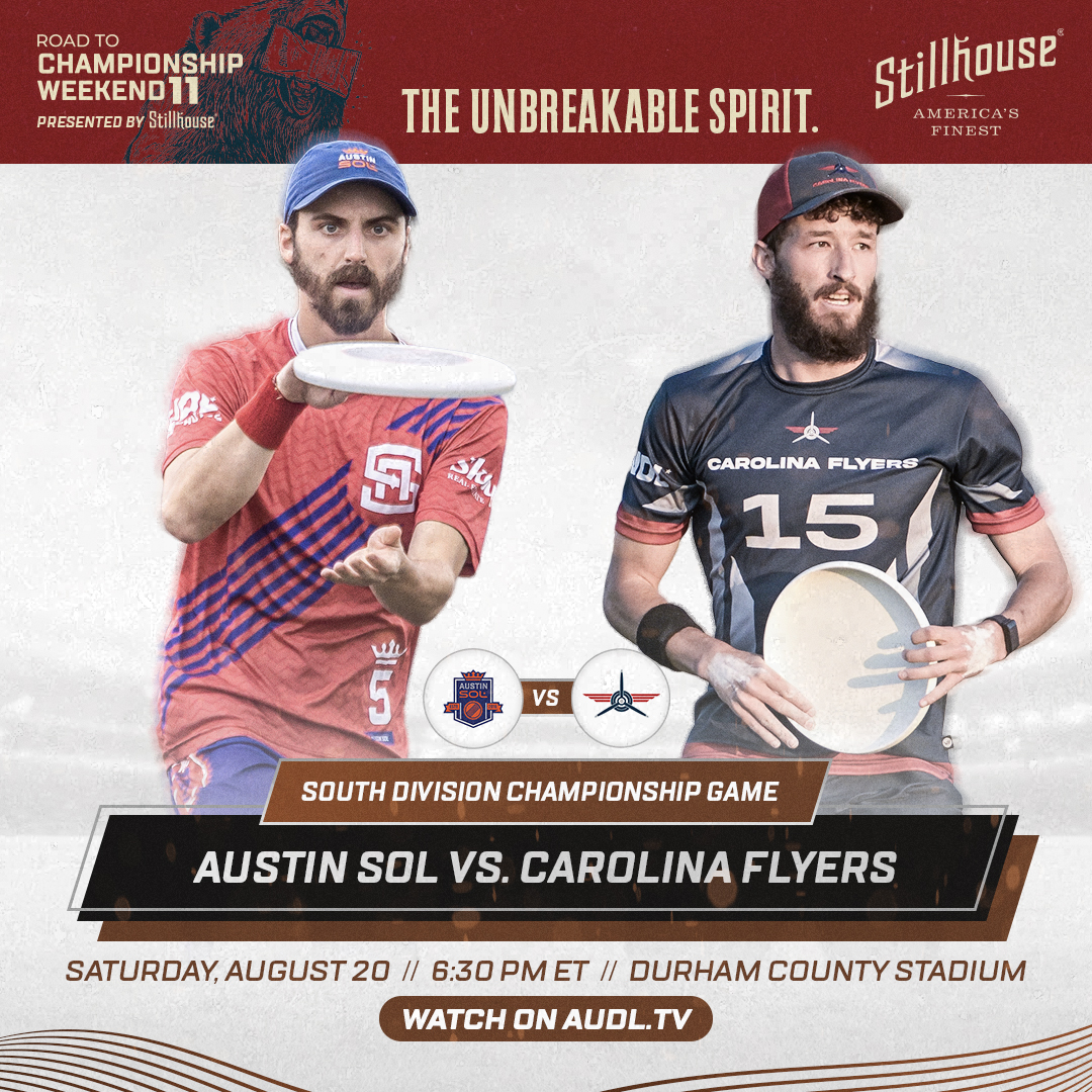 After finishing the regular season with a winning record for the first time in franchise history, the Austin Sol are looking for their first playoff win against the reigning AUDL champion Carolina Flyers. The teams have met twice already this season, splitting games 1-1 with each team holding strong at home.