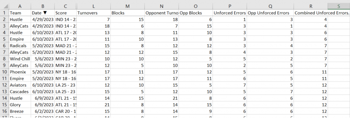 "I started looking at 'unforced turnovers' (turnovers where the other team wasn't awarded a block) across this season so far. There are only four games with less than 10 combined unforced turns. Indy played in three of them and Atlanta played in two. Worst in the league so far was a Canadian game at 39, and an Austin vs. Dallas game at 33.” Mike Kobyra, Atlanta Hustle