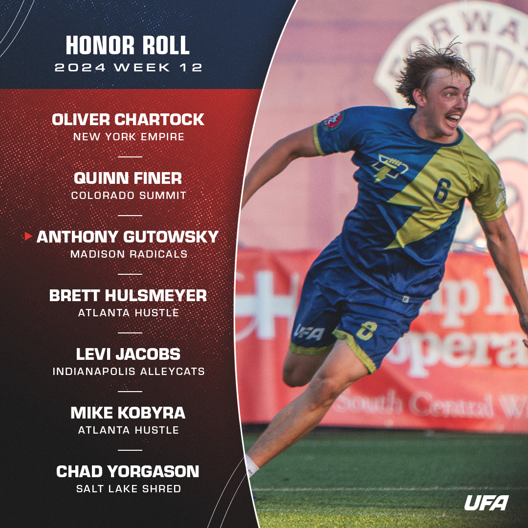His instincts, timing, and infectious energy are all big reasons why the Madison Radicals are one more home win away from a home playoff game. Anthony Gutowsky’s five-goal, one-assist stat line was relatively ordinary by his consistent 2024 standards—it was the ninth time in 11 games this year that he’s caught between four and seven goals—though it’s noteworthy that four of his six total scores came during the Radicals’ 7-1 second quarter on Friday night against Chicago. That was the key 12-minute period in terms of creating separation as the Rads rolled 21-13 to take over sole possession of second place in the Central. For the full season, Gutowsky has 49 goals, second most in the UFA. With a strong Week 13 performance in a must-win game against indy, he could become the first Radical in team history to lead the league in goals for a full season.