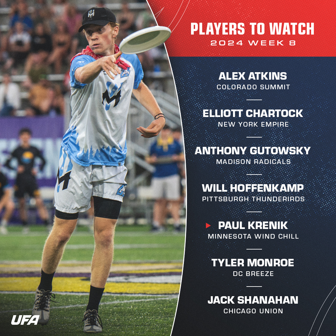 Paul Krenik made his 2024 debut last week against Indianapolis and continues to trend upwards as one of the top young players in the league. Krenik recorded two assists, a goal, and two blocks to go with over 250 total yards of offense (second-highest yardage total of his career) in Minnesota’s 24-21 victory. Despite it being his first game of the season, Krenik was on the field for a team-high 27 points. The Wind Chill have some holes to fill on defense this week without Bret Bergmeier and Sam Berglund, and Krenik is the type of player that can lead by example with shut-down matchup defense in addition to helping facilitate the counterattack after turnovers. It still hasn’t felt like we’ve seen Krenik’s true ceiling as a pro frisbee player, and with a massive matchup against the Summit this week, Saturday presents a perfect opportunity to take another step towards stardom.