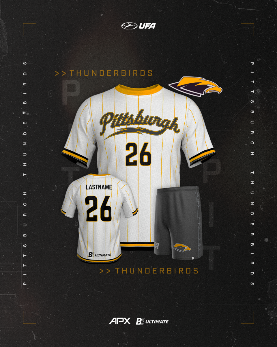 The pinstripe look is taking over the UFA, and the Thunderbirds are getting in on the trend with their away jerseys this year. A classic yellow pinstripe falls in the background to make the cursive script "Pittsburgh" across the chest pop.