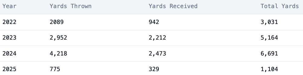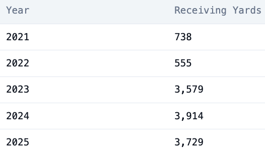 The tandem of Brett Hulsmeyer and Taylor is going to be called out a lot this season. Hulsmeyer has finished in the top three in receiving yards the last two seasons, and very well could get over the hump to get into that number one spot in 2026. With the trigger-happy offensive structure that has Hulsmeyer as its top downfield threat, and four combined matchups against Houston and Vegas, statistically the two worst defenses in the league, Hulsmeyer could finally reach the number one spot for receiving yards.