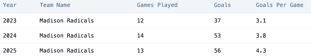 Anthony Gutowsky’s stock is still on the rise, which is hard to believe considering his number two finish in goals in 2024 and his number one finish last year. As he enters his age-24 season, he is in the prime of his athletic ability. Add on getting a full season of the two-headed backfield of Eric Sjostrom and Kainoa Chun-Moy, and that’s a great recipe for Gutowsky to continue his success in the endzone. Not to mention, he has 34 goals over eight career matchups against Indianapolis (4.25/game), a team he plays four times this year.